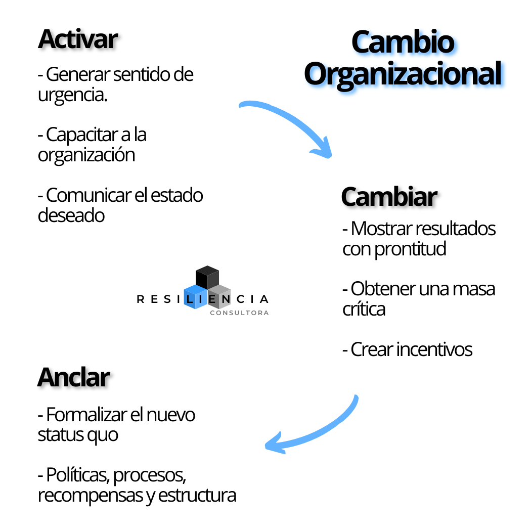Un proceso de cambio inicia por establecer el sentido de urgencia. Así, existen dos situaciones, la primera en la cual el cambio es proactivo. Es decir, la organización va por buen camino, pero hay oportunidades de ser aún mejores. La segunda, corresponde a momentos de crisis, en lo que es más probable que las personas adopten el proceso de cambio. Una vez se finalice el proceso de cambio, se deben institucionalizar las nuevas acciones, comportamientos, valores, políticas y procesos que se llevaron a cabo. Por eso, nuestro modelo en Resiliencia, siguiendo a Kurt Lewin, propone activar, cambiar, y finalmente, anclar el cambio en la organización.