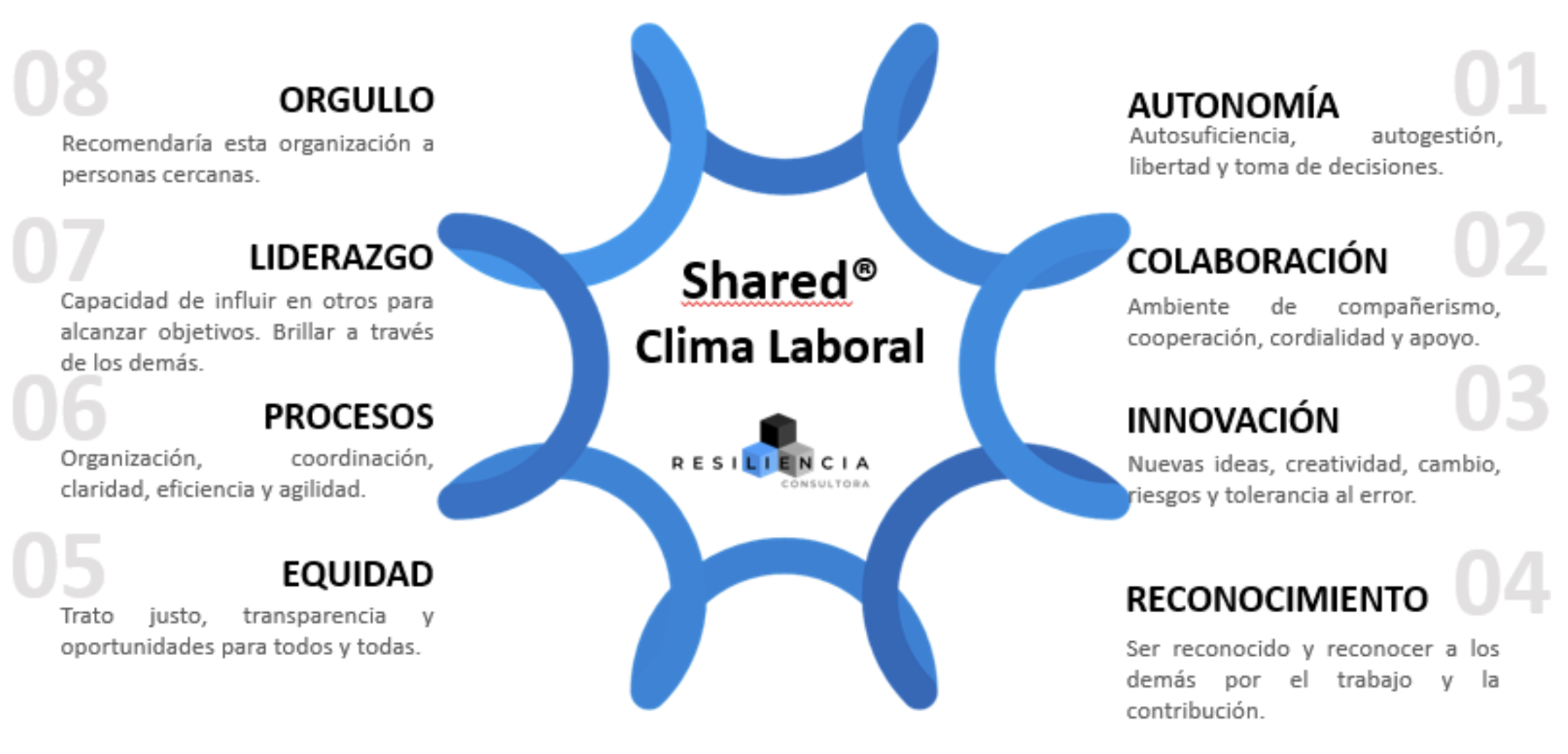 El clima laboral es una de las principales condiciones para querer quedarse en una empresa. Para construir un buen clima laboral es necesario enseñar a las personas los comportamientos y actitudes valoradas dentro de la organización. El clima laboral se sustenta en los valores de la compañía y tiene varias dimensiones. En Resiliencia consideramos que los dos principales indicadores de un buen ambiente laboral son: 1. El orgullo por trabajar en la empresa, sus colaboradores recomendarían la empresa a personas cercanas como familiares o amigos, y 2. Que exista un ambiente de colaboración entre las personas. Nuestra recomendación para su empresa es hacer mediciones de clima al menos una vez al año con una compañía especializada, hacer seguimiento a los avances e implementar las recomendaciones que surjan del análisis de las mediciones.